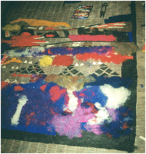 Dyed wools laid out on reed mat before felting. The ‘design’ is ‘face-down’ The method uses thin pre-felted wool and fleece. The thin sheet wool is cut with scissors and allows geometric forms to be made in contrast to the soft colours and shapes made with loose fleece. The method is typical of the Tire (pron.Tierey) felt-makers and unique to the area.